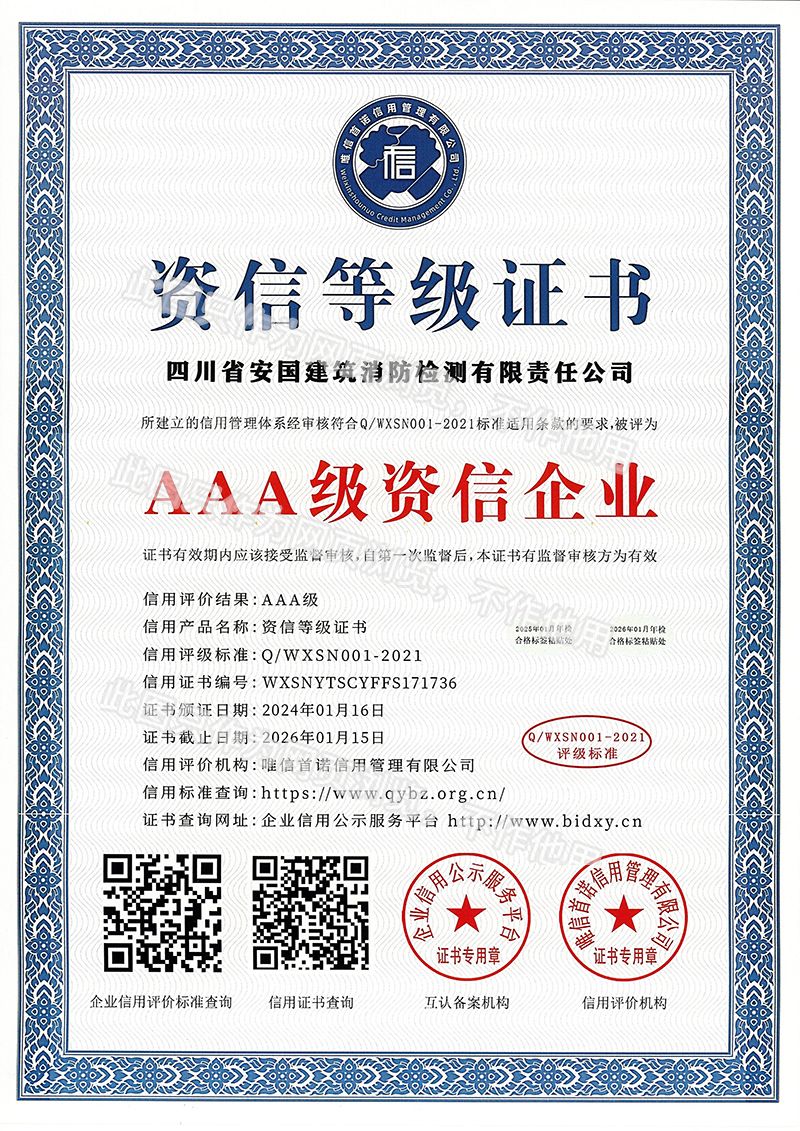 四川省安國(guó)建筑消防檢測(cè)有限責(zé)任公司,成立于1998年,經(jīng)四川省公安消防總隊(duì)批準(zhǔn),工商部門(mén)注冊(cè)的獨(dú)立法人單位。 公司具有建筑消防設(shè)施檢測(cè)、電氣防火安全檢測(cè)、維修、保養(yǎng)及技術(shù)咨詢(xún)一級(jí)資質(zhì)的中介技術(shù)服務(wù)機(jī)構(gòu),獲得CMA計(jì)量認(rèn)證。主要業(yè)務(wù)范圍是:接受建設(shè)單位或有關(guān)單位委托,承擔(dān)新建、改建、擴(kuò)建建筑自動(dòng)消防設(shè)施技術(shù)檢測(cè)、電氣防火安全檢測(cè)、以及承接建筑消防設(shè)施維護(hù)保養(yǎng),對(duì)已交付使用的建設(shè)消防設(shè)施的運(yùn)行情況進(jìn)行運(yùn)行檢測(cè),開(kāi)展建筑消防設(shè)施的消防安全技術(shù)咨詢(xún)。公司設(shè)辦公室、總工辦、財(cái)務(wù)部、檢測(cè)部、維保部等職能機(jī)構(gòu),擁有一